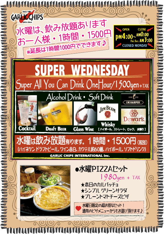 ★On Wednesdays, all-you-can-drink is available for 1500 yen per person per hour!!