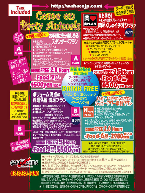 We are currently issuing coupons to extend the all-you-can-drink hours of 2.5 hours for Plan B and Meat Plan to 3 hours.